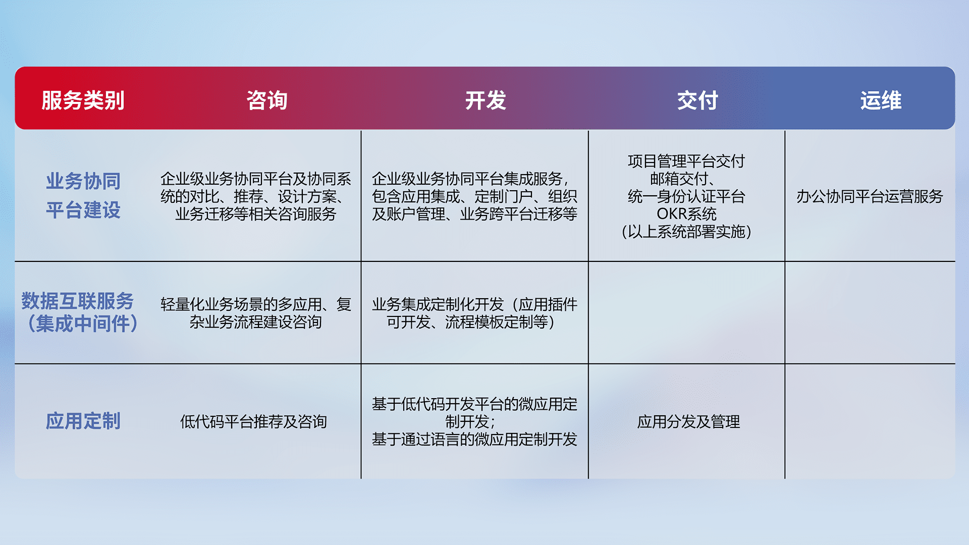 针对钉钉、、、、企微、、、、IDaas等平台级产品提供产品的规划、、方案、、、交付、、、定制化开发等服务,,实现如统一协同办公、、智能客户服务、、混合会议管理、、、智能数据查询、、等业务场景,,,实现数字化转型。。